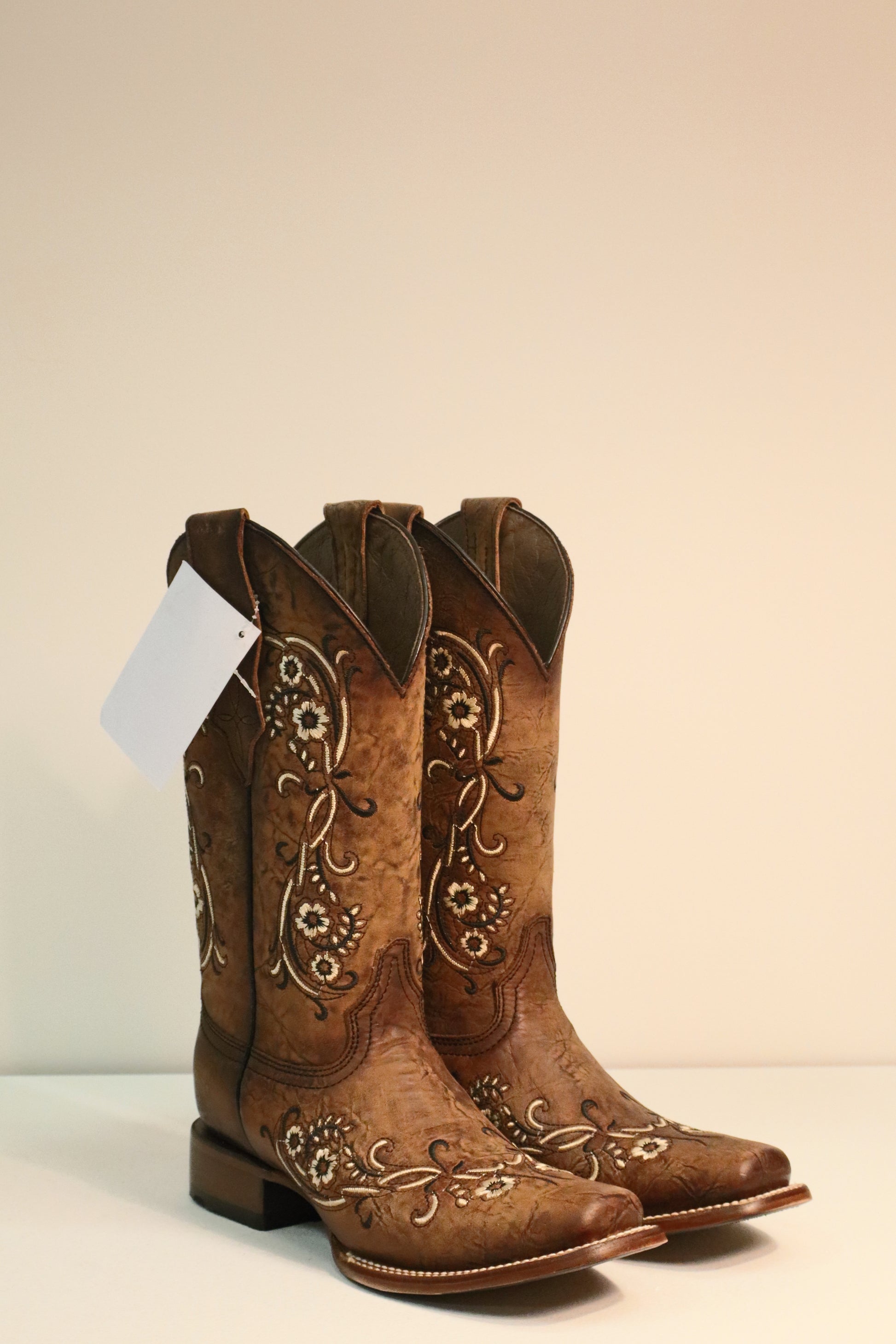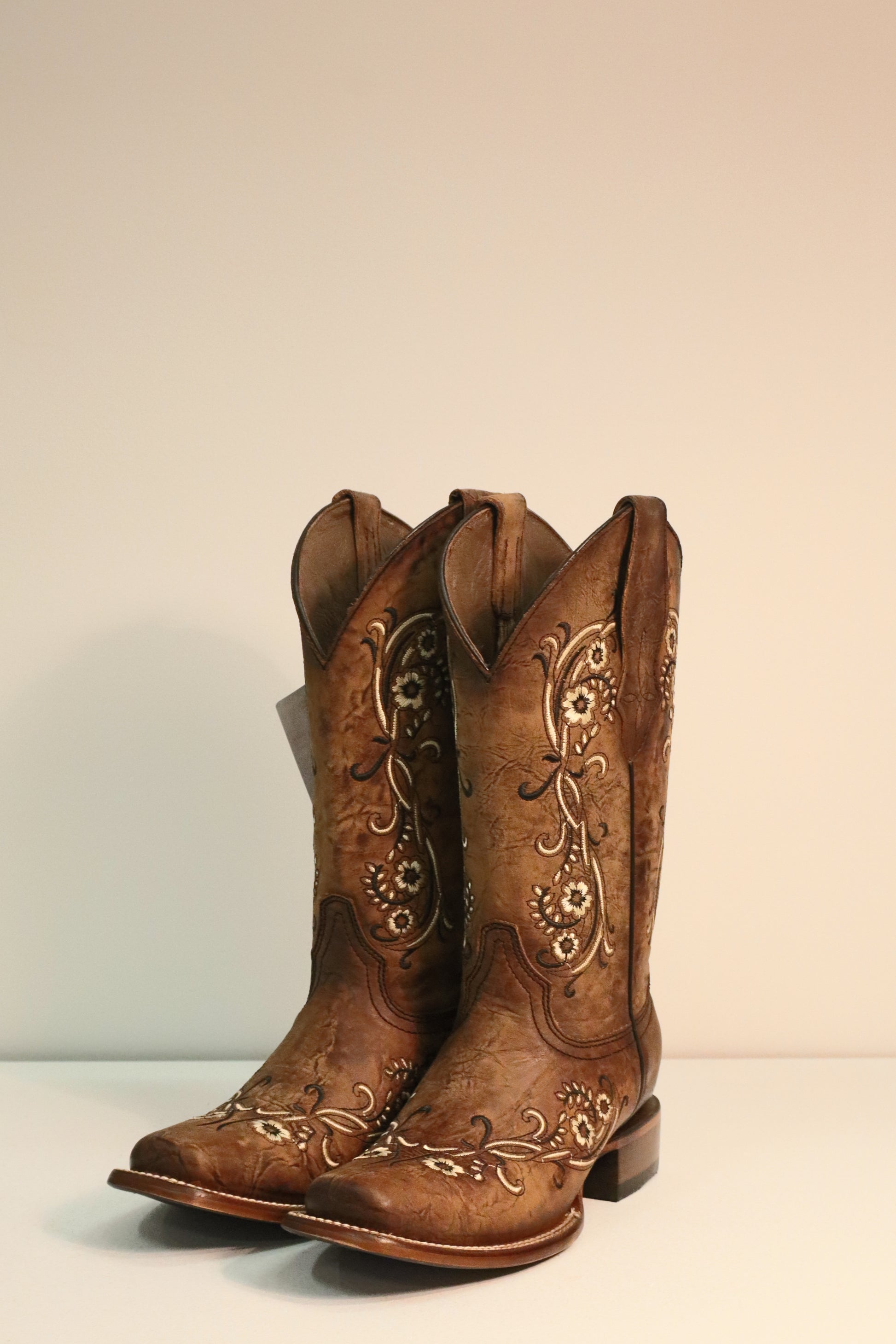 Unleash your inner fashionista with Sand Floral by Corral's Circle G. These 12" distressed cognac brown leather boots feature stunning glow floral embroidery, a square toe, and a 1.5" stacked heel. With a leather covered insole and leather outsole, these boots provide both comfort and style. Pull on straps make for easy wear.